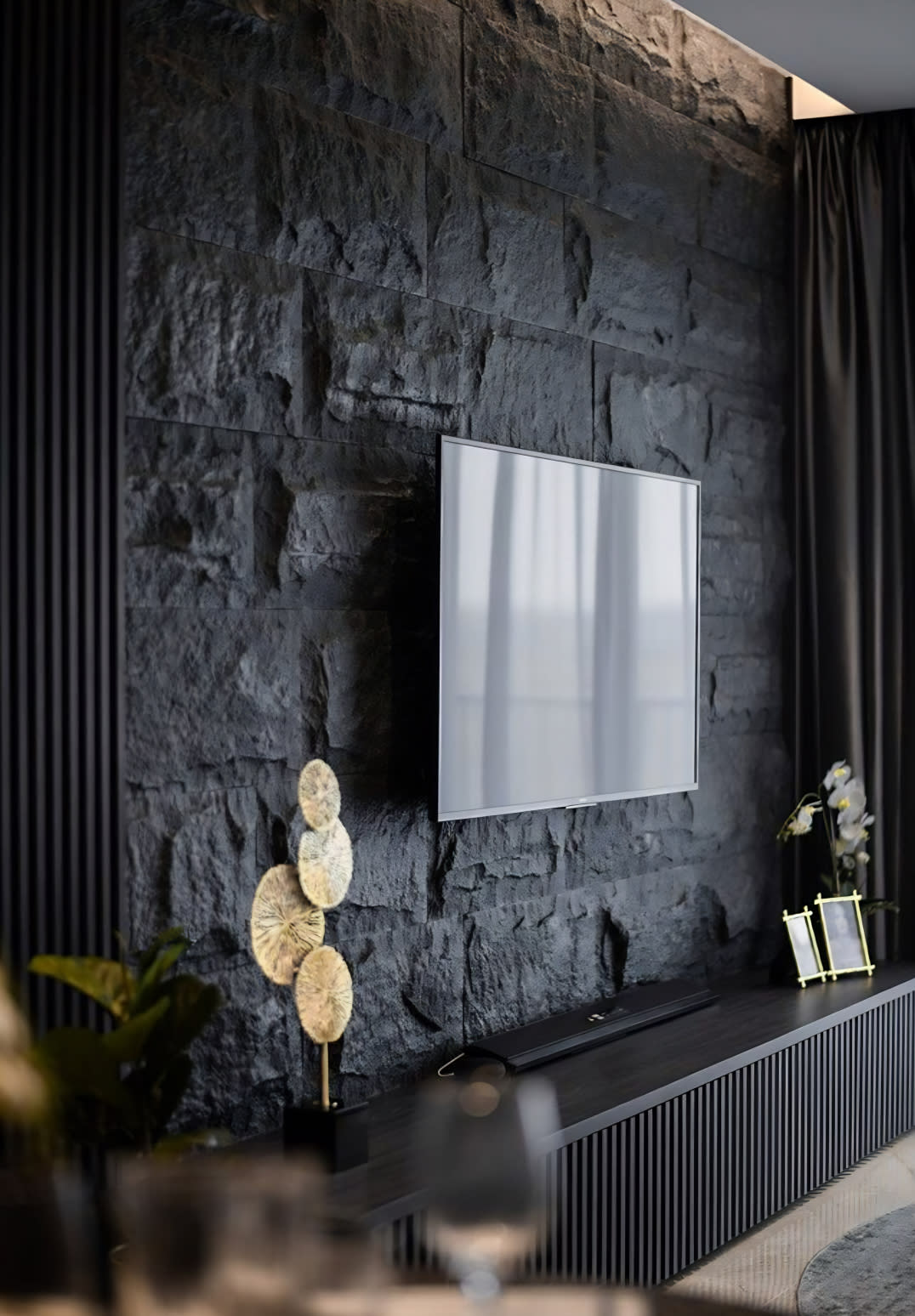 Luxury Living Room with Grey PU Stone Feature Wall Gurugram