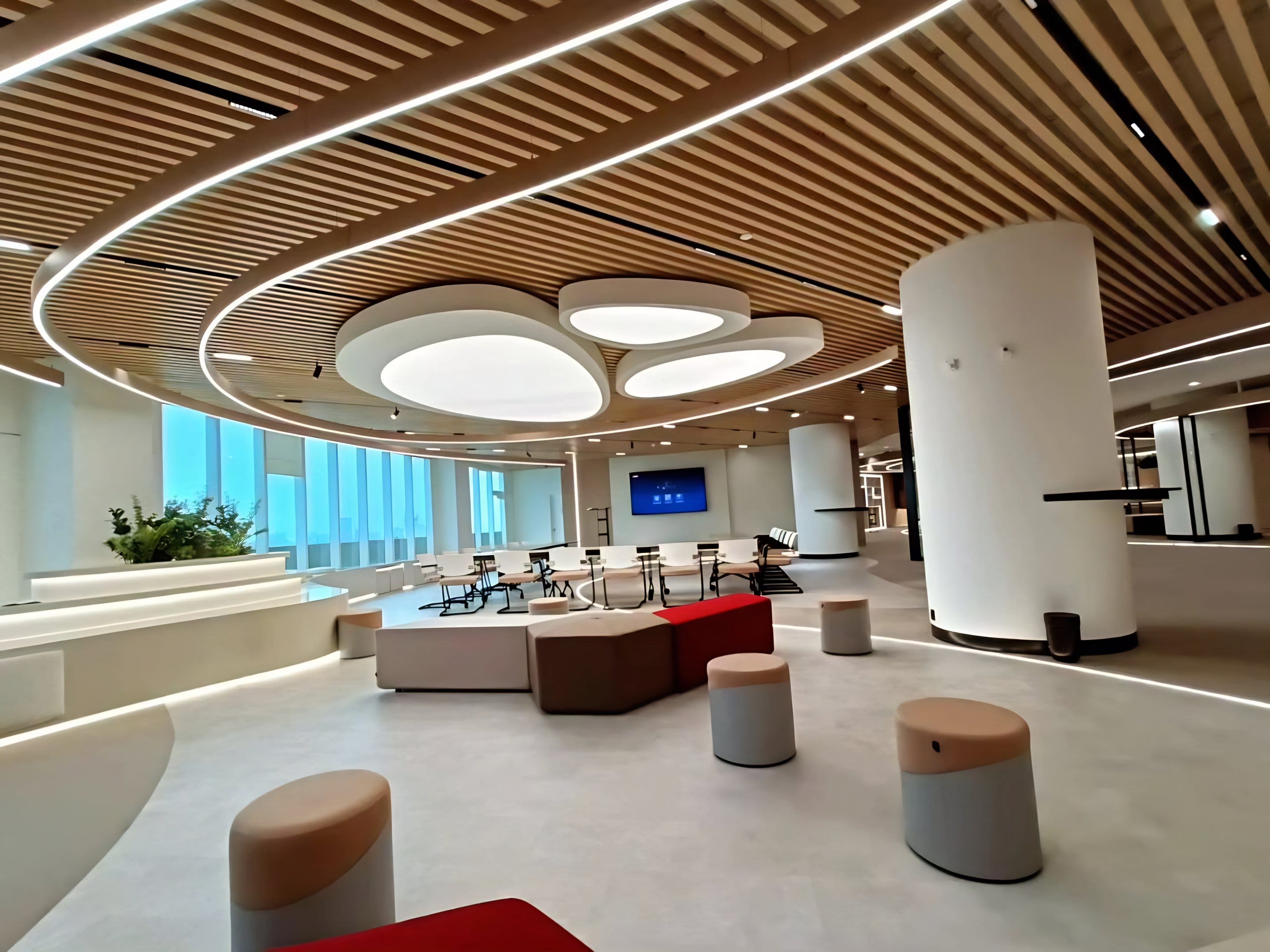 Modern Corporate Office Reception in Cyber City with Wenge WPC Baffle Ceiling